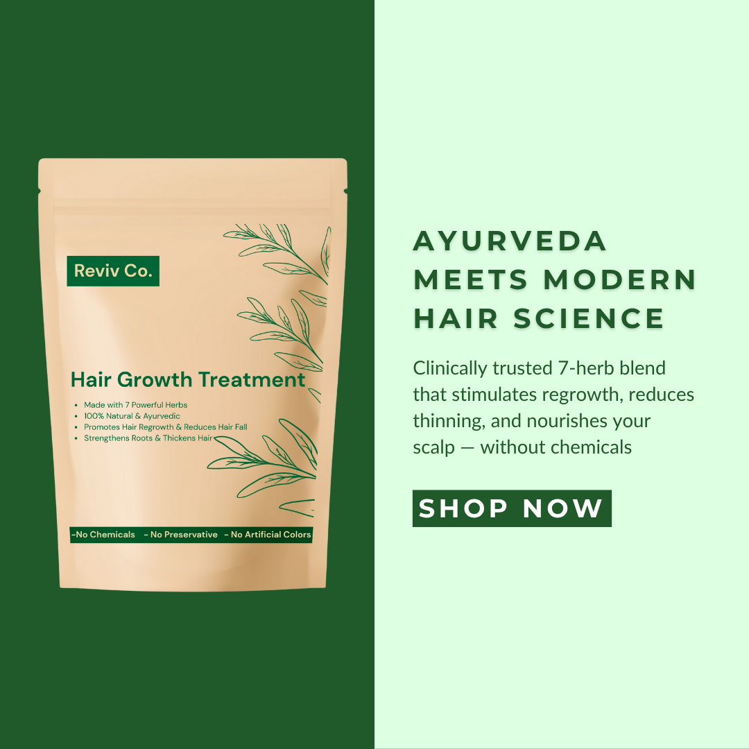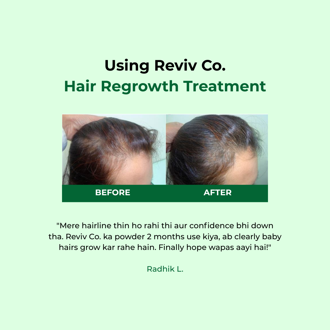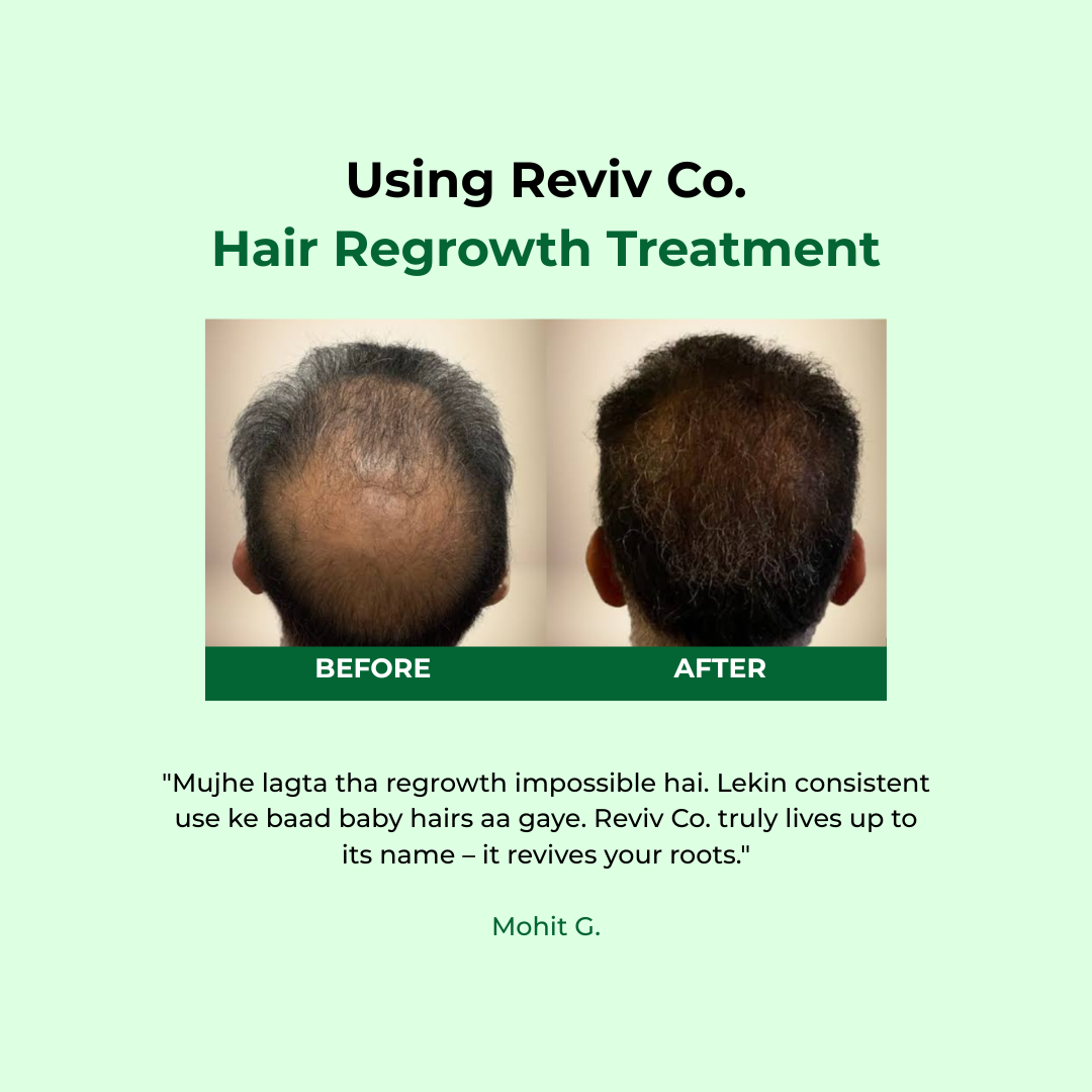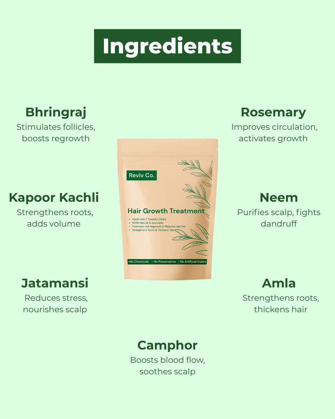Yes, our formula is crafted with 7 clinically trusted Ayurvedic herbs like Bhringraj, Rosemary, and Amla that are known to stimulate dormant follicles, strengthen roots, and promote visible regrowth. Unlike chemical products, Reviv Co. works naturally to revive your hair from the roots.